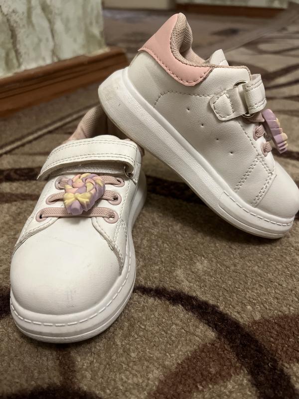 Розмір: 24 Замір устілки: 15 см Колір: Біло-рожеві Матеріал: еко-шкіра Бренд: Kimboo Сезон: літо, осінь В середині кросівок є сліди експлуатації, яки можна позбутись після прання. З дефектів тільки носки трішки затерті, але то не кидається в очі( фото додала)