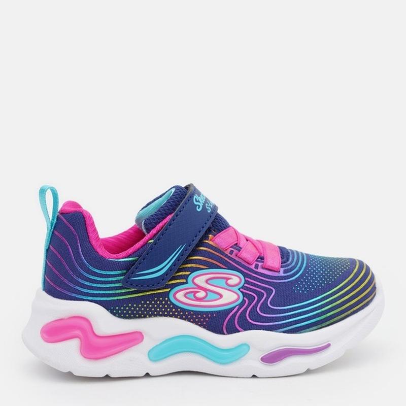 Дитячі кросівки Skechers Wavy Beams мають яскравий та барвистий дизайн. Переважає темно-синій колір, доповнений яскравими акцентами рожевого, бірюзового, фіолетового та салатового кольорів. Застібка: Кросівки оснащені еластичними шнурками та регульованою застібкою-липучкою на підйомі, що забезпечує зручну фіксацію. Модель має м'яку комфортну устілку та гнучку підошву. В гарному стані 23 розмір