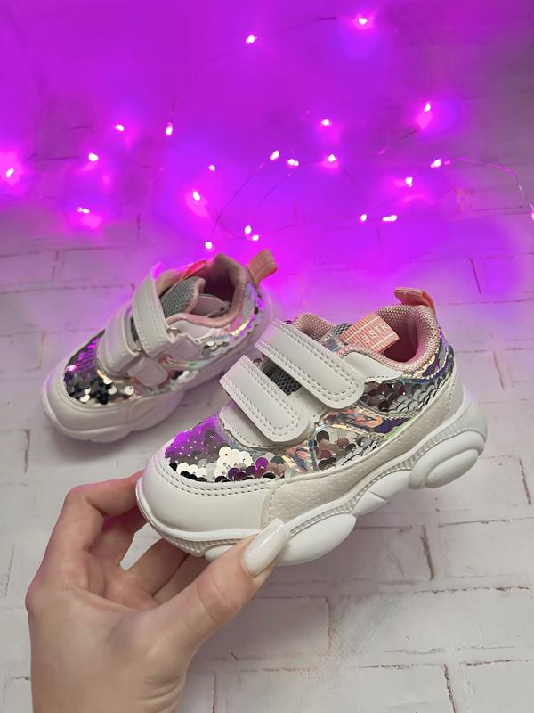 Шикарні кросівки для дівчинки на весну/осінь) розмір 22, по устілці- 14 см) новенькі ) Дуже стильні, блискучі, на липучку) Ідеальні на весну або осінній період) Абсолютно новенькі та дуже зручні 💗тапочки)