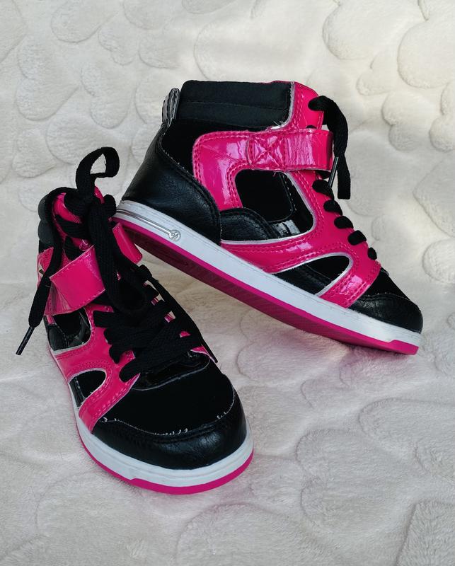 Детские кроссовки (хайтопы) для девочек, модель из линейки Sansha (французский бренд) Оригинал. Модель: Sansha видна по логотипу на боковой стороне и на язычке. Размер: US 13 (детский), что соответствует EU 31; Длина стельки 19,5 см; • Цвет: чёрный с ярко-розовым (фуксия) глянцевым покрытием • Материал верха: синтетика (patent leather look — глянцевая искусственная кожа) • Особенности: высокие, с двумя липучками и шнуровкой, вырезы по бокам (для лучшей вентиляции и гибкости), сплошная подошва с хорошим сцеплением, подходит для ходьбы по улице и для танцев на паркете. Это очень популярная модель. Девочки их очень любят за яркий вид и то, что они удобно фиксируют голеностоп (важно при прыжках, а также поддержках в танцах). Состояние отличное. Есть нюанс -смотрите на последнем фото: на лаковой липучке есть небольшое пятнышко (потемнение).