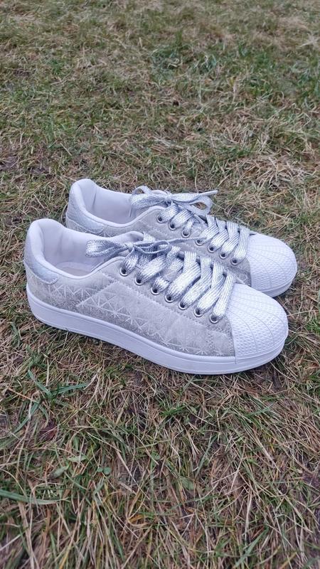 Сріблясті кеди для скейтбордингу з текстурованим верхом та блискучими шнурками. сріблясти...