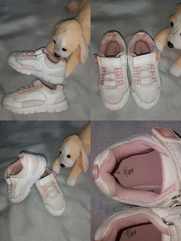 На зображенні представлені дитячі кросівки TU Kids розміру 9. Бренд і розмір: Взуття належить бренду TU Kids, розмір 9. Дизайн і застібка: Кросівки білого кольору з рожевими акцентами (внутрішня підкладка, петлі для шнурків, липучки). Вони обладнані застібками-липучками для зручності надягання. Шнурівка: Шнурки являють собою імітацію і тягнуться.