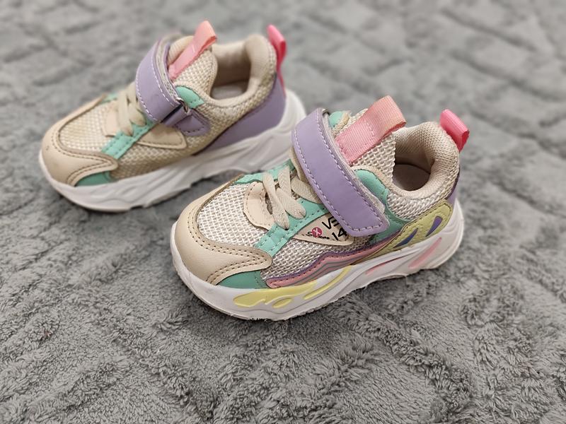 Детские демисезонные кроссовки для девочки. Размер: на этикетке указан 23, но маломерит!! Фактически размер 20!!! Длина стельки: 13,5см, идеально подойдет на длину стопы от 12,7-13см!! Цвета: Обувь выполнена в пастельных тонах, включая бежевый, мятный, розовый, сиреневый и желтый акценты. Материалы: Верх комбинированный, состоит из сетчатого текстиля и элементов из искусственной кожи. Детали: Присущая массивная белая подошва и комбинированная застежка - шнуровка (резинка) и регулируемая липучка сиреневого цвета. Дизайн: Современный, спортивный стиль с удобным высоким задником и мягкой внутренней отделкой.