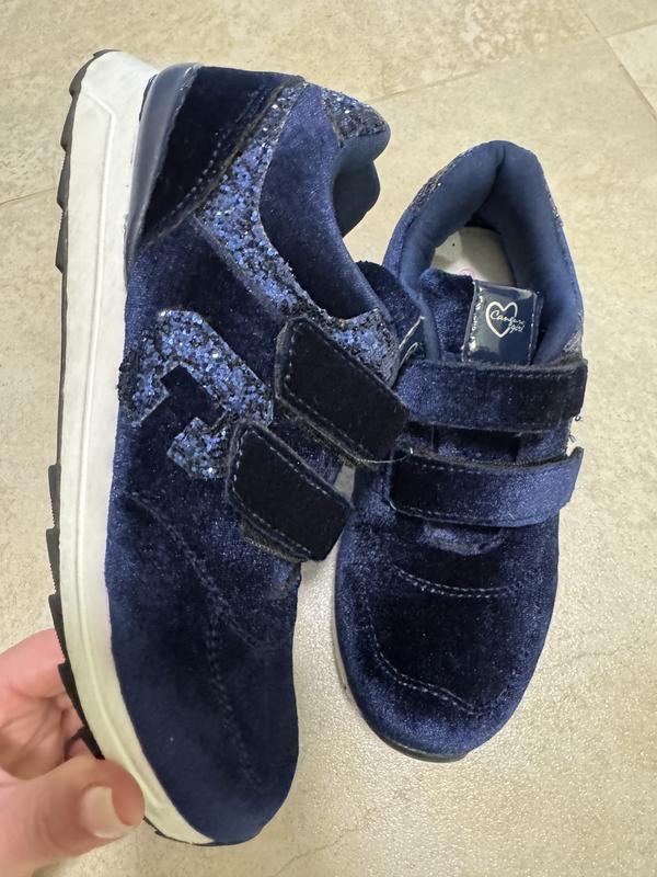 Нові, Взуття виготовлене з м'якого велюру (оксамиту) зі вставками з блискіток (глітеру) на бічних частинах та заднику. Кросівки мають зручну фіксацію на двох ремінцях-липучках та контрастну білу підошву Устілка 21,5 ( шкіра)