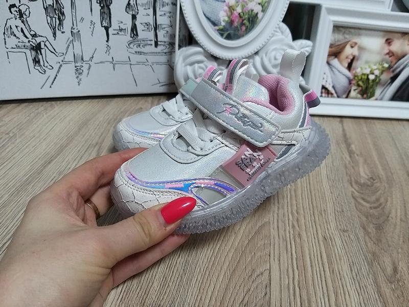 Цвет белый с перламутром и цветными вставками. Еко-кожа . Светящаяся высокая подошва. Стелька Кожаная+Супинатор Удобная застежка липучка. Шнурки резинки Очень дегкие и удобные Стелька внутри в см: р.23-14.5 см-1 п р.24-15 см-2 п 15#