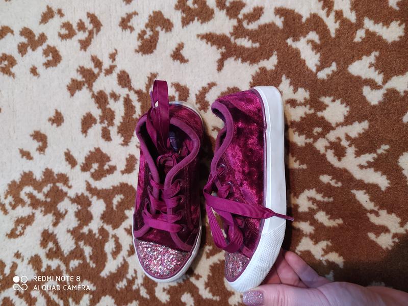 Дуже гарні кеди для дівчинки. Матеріал зверху велюр, носик в блискітках, матеріал середини: текстиль. Стан ідеальний.