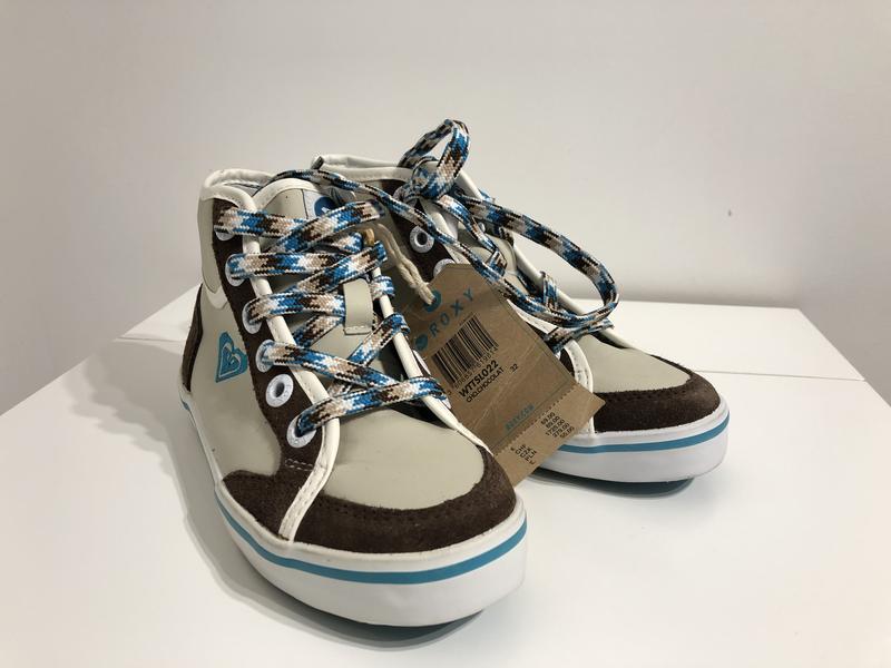 Нові кеди Roxy {з Європи}, на шнурівці, розмір 32. Матеріал: верх - текстиль; підкладка - текстиль; підошва - полімер Трохи жовтувата пʼятка-гуми підошви, та тільки на правому кеді (вітрина)