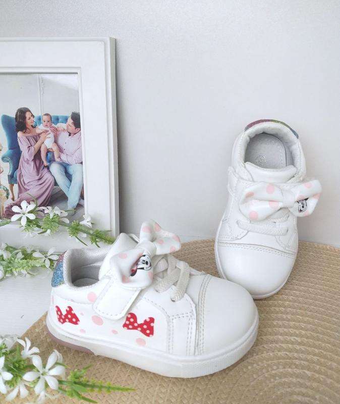 К.367 Totti Кроссовки W.Niko с минни, белые, верх эко-кожа, внутри текстиль, стелька кожаная с супинатором, регулируются шнурками резинками и липучкой. 22р стелька 13,5см 23р стелька 14см 23р стелька 14см 23р стелька 14см 26р стелька 16см Цена 370грн