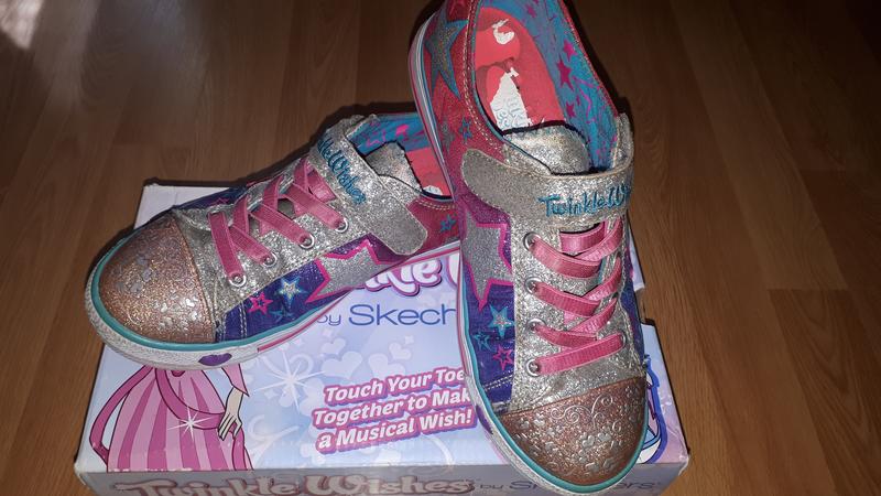 Очень красивые и стильные кеды Skechers Kids Twinkle Wishes-Enchanters Light-Up . Застежка: шнурки-регулируются+липучка. Яркие, удобные. Мигает носочек и огонек в звездочке сбоку. Размер:2,5 USA, 1.5 UK, 34 EUR длина стельки 21 см. Нюансы указаны на фото 7-8.