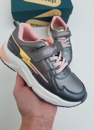 Кросівки для дівчинки від Weestep в кольорі графіт. Чудова якість ! Стильні та легкі ! Верх - шкіра комбінована, устілка шкіряна із супінатором. Доступні в розмірах : 29 р - 18,5 см 32 р - 20,5 см