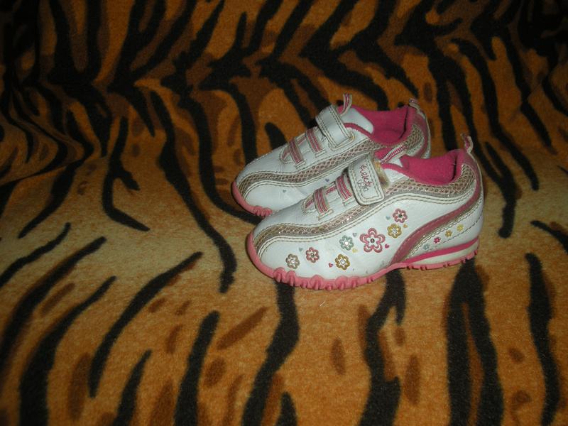 Шикарні дитячі кросівки білого кольору з купою прибамбасів-по всьому полю квіточки з камінчиками всередині,які світяться при русі,блискучі гумки на застібці,блискучі смужки з боків,застібка на липучку з емблемою фірми,фірмова рожевого кольору підошва,легкі,зручні кросівки,всередині зручна устілка.