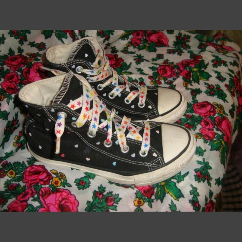 Суперові кеди насичено чорного кольору в яскраві сердечка.Модні та орегінальні,зручні та надійні.Ціна 199грн.Буду рада відповісти на Ваші питання приємного перегляду.