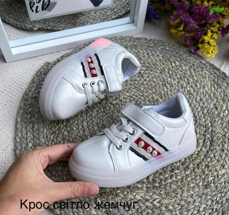 Кроси з підошвою, що світиться! Верх- екошкіра, нашивки і перлини. Застібка- липучка і шнурок. Устілка – шкіра, супінатор. Дуже легкі- невагомі. Розміри: 23-13,9 24-14.5 26-15,5 27-16,**********,0 Ціна: 305 грн