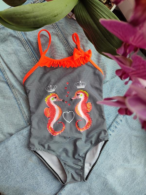 Красивый купальник в полоску с морскими лошадями Стразовый декор на лошадях Стан идеален, без дефектов длина без бретель 41см,бедра 28.5, боковой шов 22см