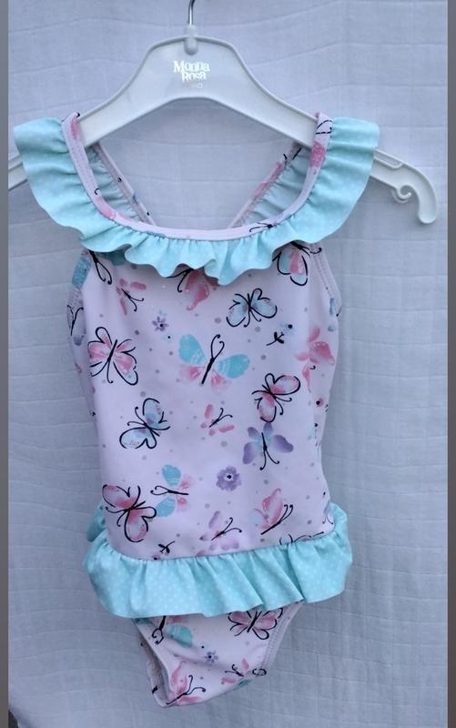 Яркий купальник розово-голубого цвета с блестками на девочку 12 месяцев. Цельный.