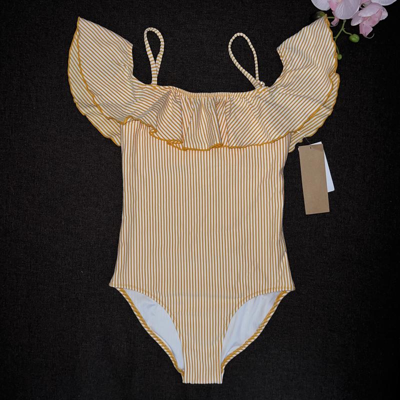 Слитный купальник в вертикальную полоску. на спинке - переплет. размер: 12 лет