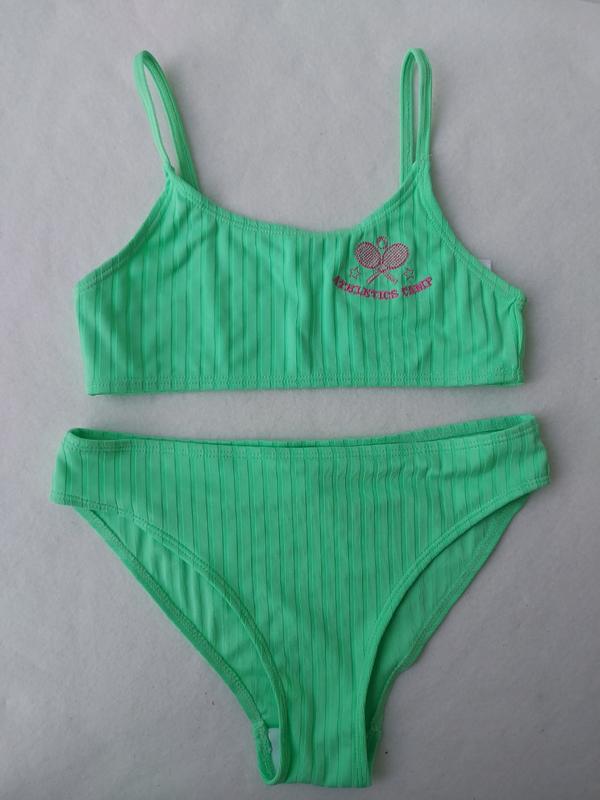 Купальник для девочек 10-11 лет ТМ Primark. С изнанки есть гигиеническая подкладка Плавки средней посадки. Тканина яскрава, соковита, в широкий рубчик. Топ: Высота: см Под грудью: см Плавки: Высота: см Пояс: см Цвет: зеленый.
