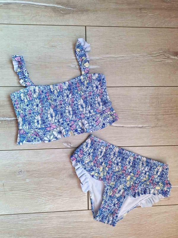 9 років,134 см,топік довжина 31 см максимально( можна меньше,регулюється),ширина 30 см,плавки довжина 23 см,пояс 27 см( тягнеться),стегна 32 см( гарно тягнеться),купальник на дівчинку Shein,стан нового