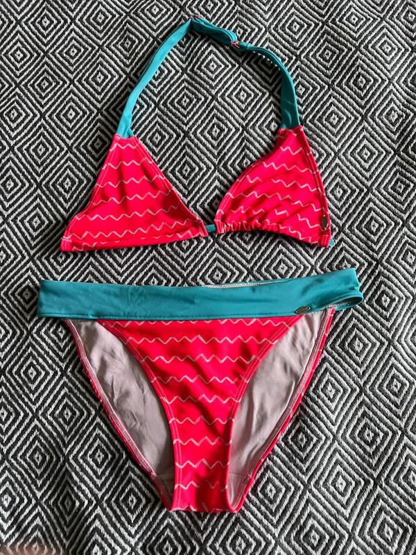 Яркий и стильный детский купальник из двух частей в розово-бирюзовых цветах с геометрическим узором. Верх - удобный треугольный лиф на завязке, хорошо держится и не сковывает движений. Низ - классические плавки с комфортной посадкой и мягким поясом. Преимущества: приятная к телу, быстро сохнет не давит и удобен для активного отдыха идеально для моря, бассейна, отпуска Состояние: идеальный Подойдет для пляжного сезона ☀️ ПО-ПИД грудью 31 регулируется ширина чашки 12 длина чашки 12 низ пояс 34.5 длина 21
