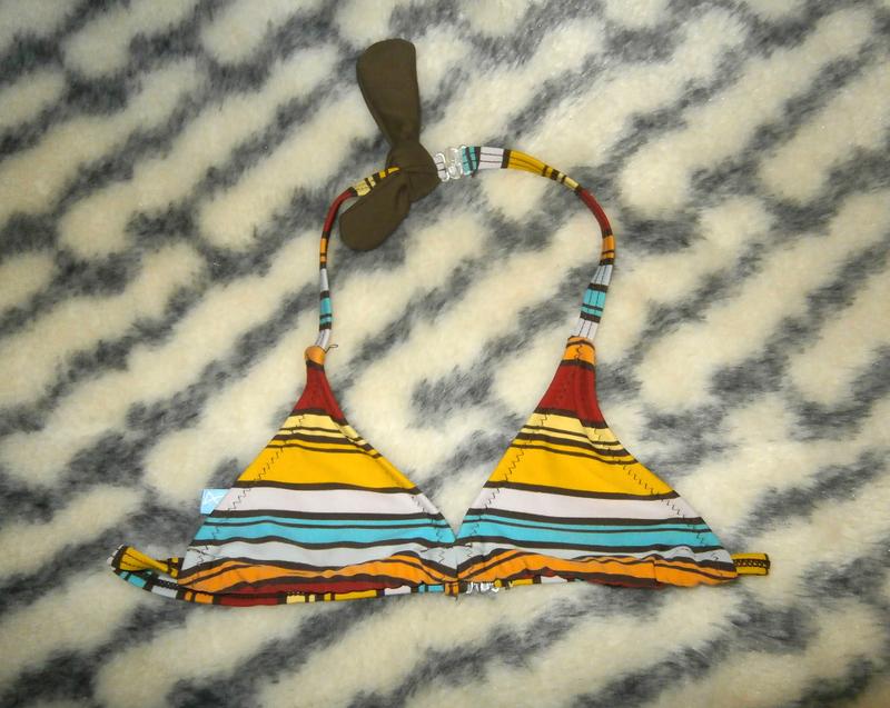 Полосатый верх от купальника для девочки Joe. Размер - 5 лет. Длина в спокойном состоянии 53 см, тянется до 73 см. Состав: 80% нейлон, 20% еластан. Состояние очень хорошее