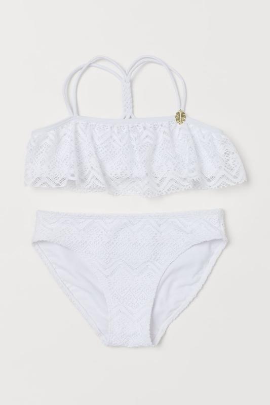 Бикини. Верх на подкладке с широким воланом и узкими двойными бретелями, которые соединяются, образуя плетеную спину-гонщик. Низ на подкладке. Размер 10-12Y (146-152)