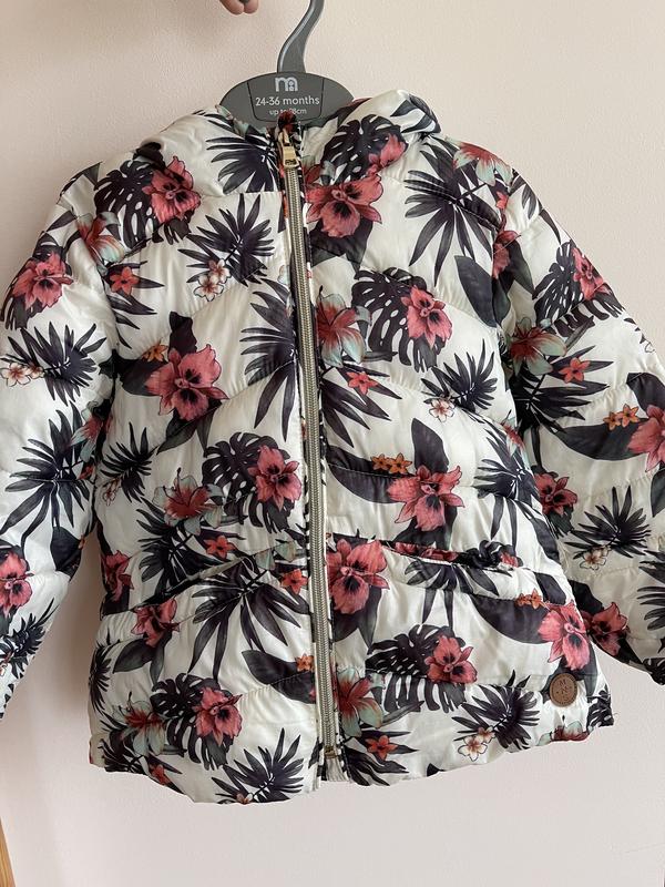 Красива і легенька курточка від Mango, розмір 116. Є нюанси - дивіться фото: була дірка біля рукава - зашили (фото 4), на манжетах є сліди носіння (втрачений колір - фото 5), біля замку є плямки і загнутий зубець на замку (фото 6). Заміри: Плечі - 30 см Довжина - 43 см, Рукав від шиї/плеча - 40/45 см Під рукавами - 37 см