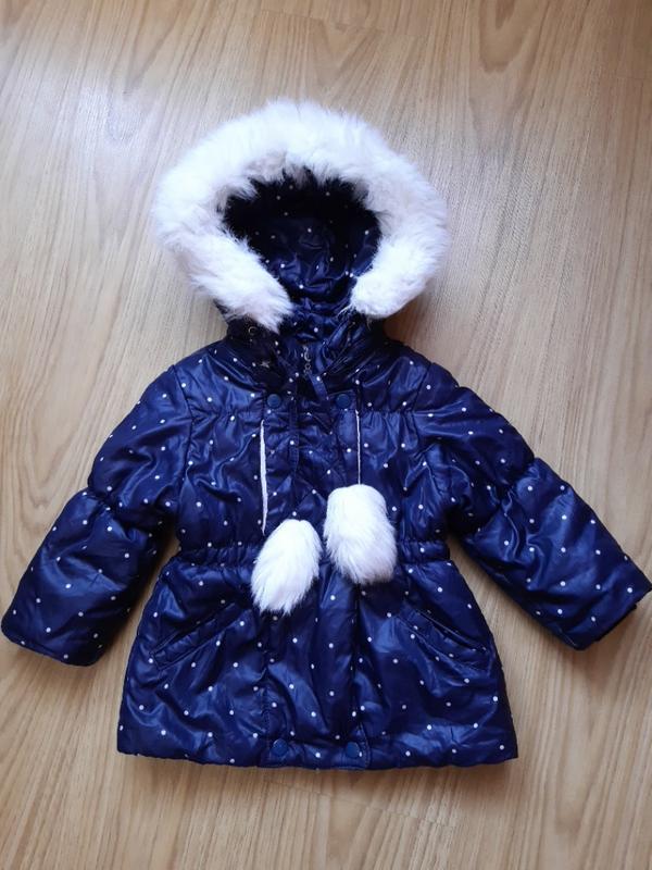 Курточка на дівчинку 2 років. Замок робочий, капішон зйомний (хутро теж), на рукавах внутрішні манжети-резинки. Довжина - 42.5, плечі - 29, рукав - 30.5, ПОГ (по верху)- 34. На останньому фото - маленькі дирочки (заціпили🙁), які можна акуратно зашити.