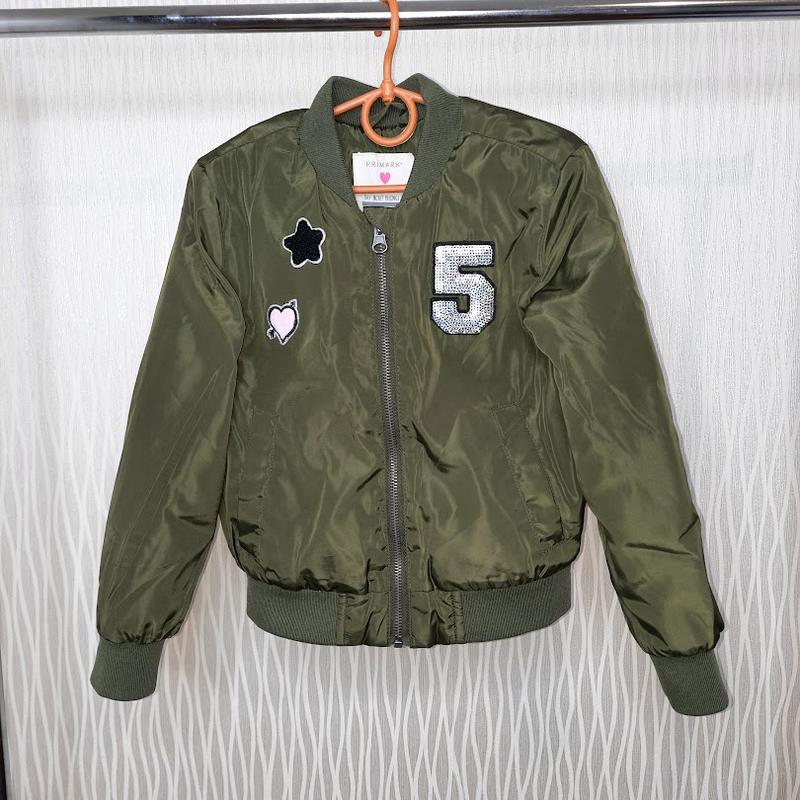 Красивая демисезонная куртка бомбер с модными нашивками девочке Primark. Внутри утеплена синтепоном, меховая тепленькая подкладка. Цвет хаки. Размер 5-6 лет, 116. Длина 38, плечи 30, рукав 41,5, ПОГ 38. Состояние отличнейшее.