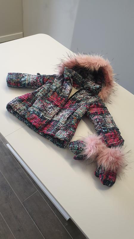 Курточка на розмір 92см. Тепла, зимова. капішон відстібається. мєх знімається. з карманами. не марка. дуже гарний колір. вживу дивиться ще гарніше. стан ідеальний. в комплекті рукавички, які пристібаються до куртки щоб не згубились. підійде на вік 2-3 роки. довжина 47см рукав 34см. в плечах 31-32см Є до неї комбінезон на такий же вік. дивіться мої оголошення.