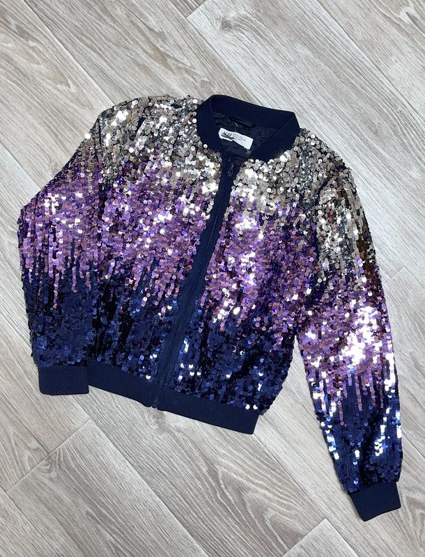 Куртка-бомбер с двусторонними пайетками. Воротник-стойка в рубчик, застежка-молния спереди с защитой подбородка и резинка на манжетах и подоле. На подкладке. 3-4 года Длина 37. ПОГ 35. Рукав 36 5-6 лет (2) Длина 40. ПОГ 37. Рукав 41 8-9 лет (3) Длина 45. ПОГ 41. Рукав 50