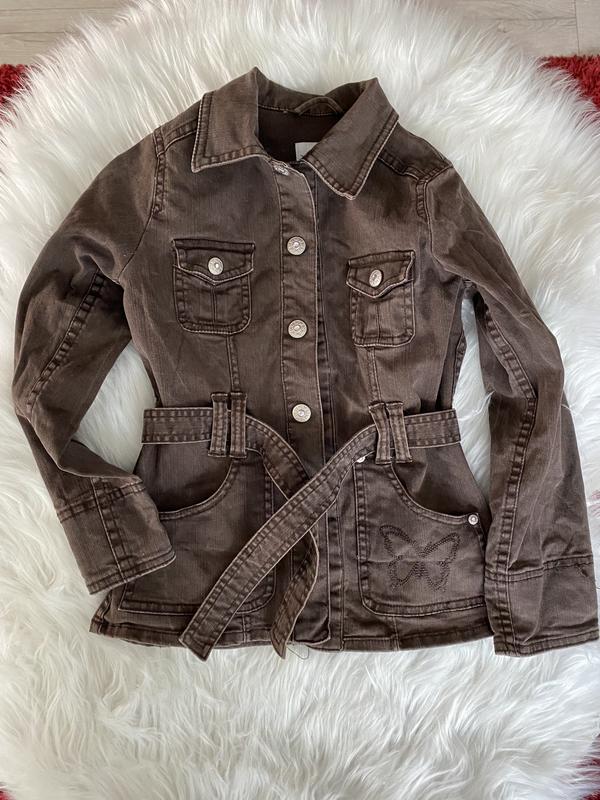 Стильний блейзер для дівчинки під пояс на ґудзики коричневого кольору: Підійде на 6-8 років оріентуйтесь по заміра Тягнеться Щільна Довжина 49 см) Плечі 27,5 см) Рукав 46 см) Пог 35,5 см) Пот 32,2 см) Знизу 37,5 см)