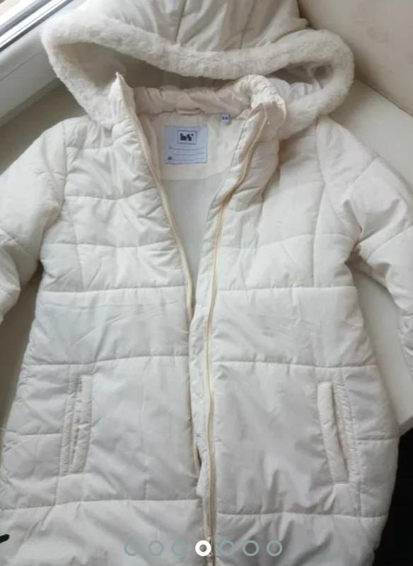 Белая куртка на девочку 8-10 лет но лучше ориентироваться по замерам: ПОГ 40см., ПОБ 48, Длина куртки 66см. Рукав 52см., плечи 32см. Теплая, но не пуховик, есть небольшой утеплитель (состав его на этикетки не нашла, похож на био-пух). Очень нежная и невесомая. В идеале.