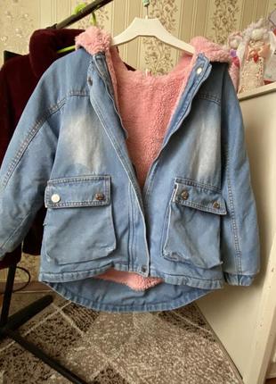 Джинсова тепла куртка з рожевим хутром. По бірці на 130 см. Приблизно на 7-8 років. Майже як нова🔥