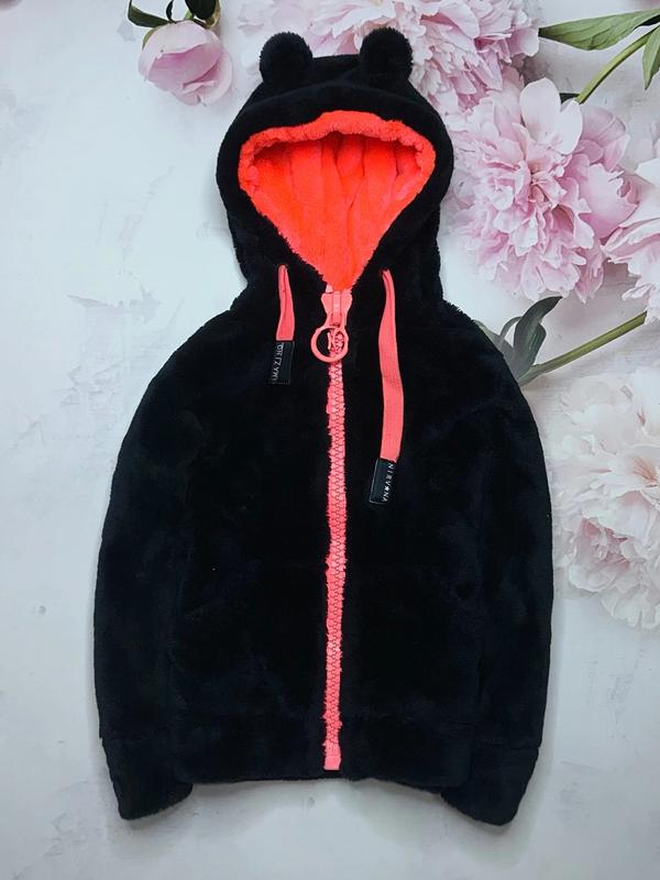 Очень теплая, махровая куртка Спереди 2 кармана Стильная массивная змейка Высокая горловина Капюшон с ушками Плотная и качественная махра, можно носить вместо Деми куртки. Состояние как идеальное 12 лет Длина 55. ПОГ 48. Рукав 51-61.