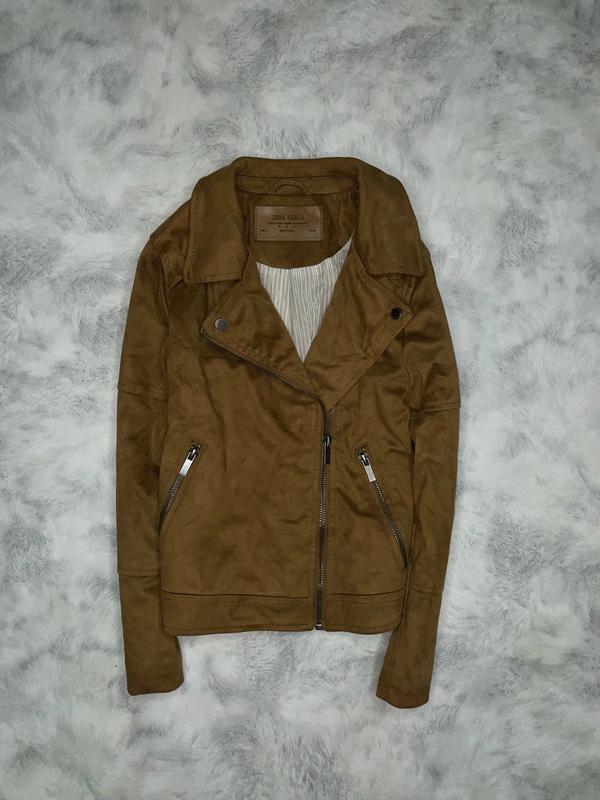 Курточка косуха из искусственной замши Спереди 2 кармана Подкладочная ткань коттон Декорированные замочки на манжетах Состояние идеальное 🏷Zara 8 лет/128 Длина 45. ПОГ 36. Рукав 46. Плечи 31