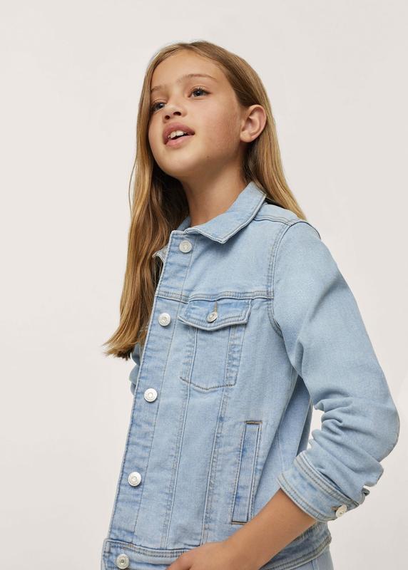 Джинсовая куртка MANGO для девочки на 5 лет на р.110. Хлопчатобумажная ткань в стиле джинсовой ткани . прямой дизайн . средний дизайн . Классический воротник . Длинные рукава с манжетами на пуговицах . На груди два накладных кармана с клапанами на пуговицах . Два боковых кармана . Застежка на пуговицы спереди . длина - 36 см, полуобхват под мышками - 33 см, длина рукава - 36 см, длина плеча - 8 см. Состав: 99 % хлопок, 1 % эластан.
