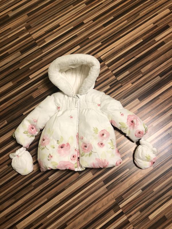 Очень тёплая и красивая курточка на девочку 9-12 месяц. Внутри мех, по низу резиночка , есть варежки на липучках. Не промокает . Состояние Новой вещи .Носили один сезон.