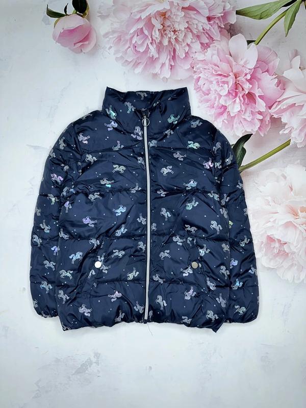 Зимняя куртка с единорогами Подкладочная ткань полиестер Высокий ворот Внутренняя защита молнии Передние карманы Состояние отличное 🏷️H&M 7-8 лет Длина 52. ПОГ 44. Рукав 47