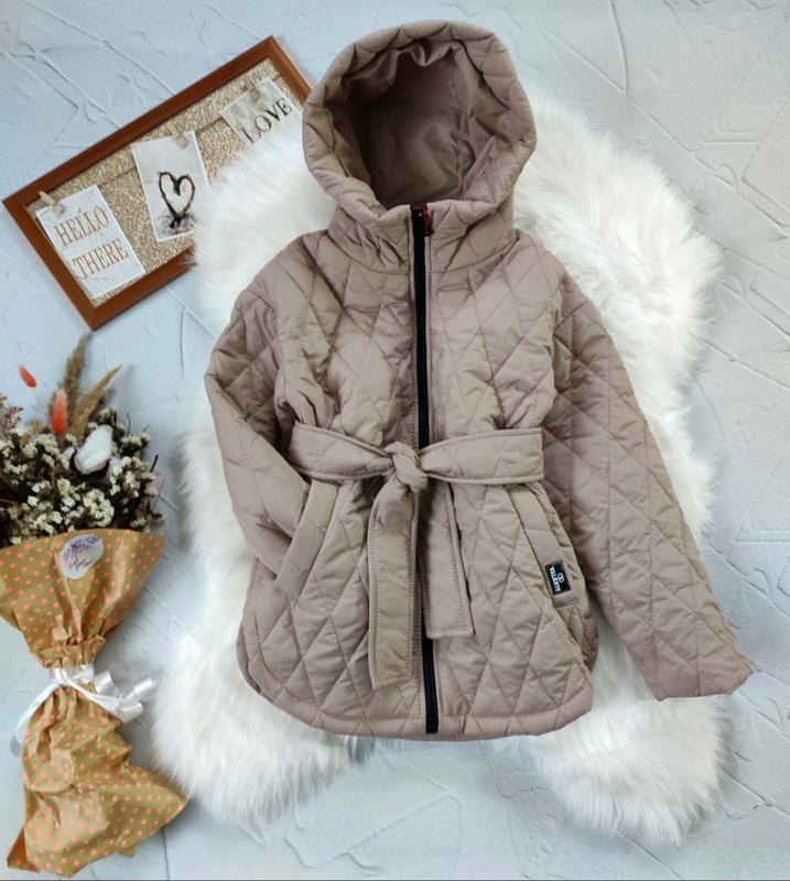 Модна стьобана куртка з капішоном має поясок тканина матова плащівка утеплювач силіконізований синтепон 100,колір бежевий ВІДМІННА ЯКІСТЬ! 134(2 шт)-довжина 60,пог 44,рукав від горловини 59 140(3 шт)-довжина 62,пог 45,рукав від горловини 61 146(2 шт)-довжина 63,пог 47,рукав від горловини 63 152(4 шт)-довжина 65,пог 48,рукав від горловини 65 158(2 шт)-довжина 68,пог 50,рукав від горловини 67 +-2 СМ