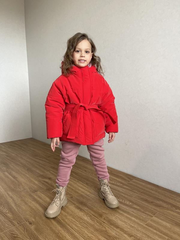Куртка демісезонна червона на флісі з капюшоном під поясок для дівчаток
