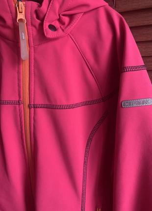 Куртка прямого силуэта выполнена из водоотталкивающего текстиля. Материал softshell является атмосферостойким, кроме того, поверхность ткани обработана водоотталкивающей пропиткой. Детали: съемный капюшон с флисовой подкладкой, воротник-стойка, застежка на молнию, два втачных кармана по бокам, регулирующая кулиска по нижнему краю, флисовая подкладка, светоотражающий элемент на спинке.