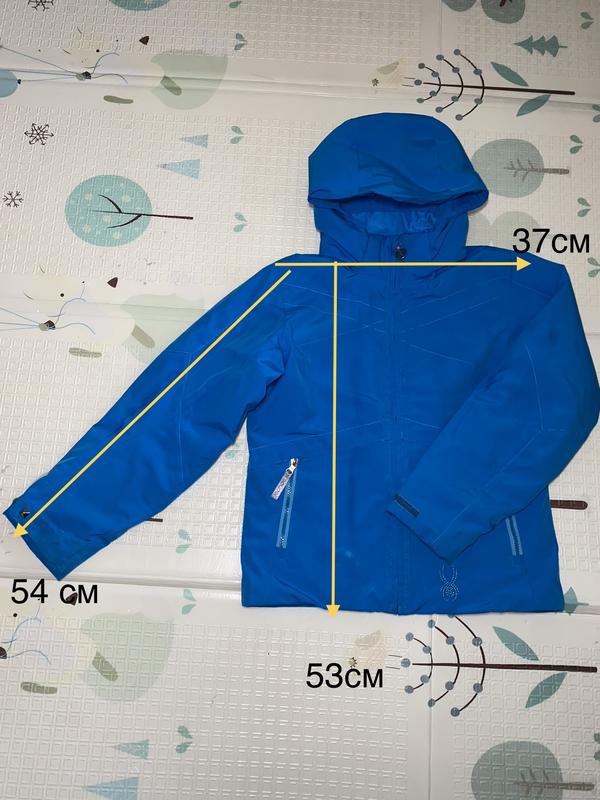 размер 140, на 10 лет. Теплая зима, холодная осень. Не продувает, не промокает. Куртка гарно прокатилась на лижах. Есть недостатки в виде потертостей и один прорезь(на фото).