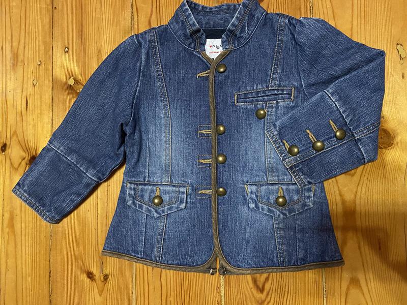 детская синяя куртка для девочки джинсовая с карманами на пуговицах и с хлопковой подкладкой на возраст от полтора года до двух с половиной . Длина - 37 см . Полуобхват - 29 см . Длина рукав - 31 см .манжет рукавов можно подвернуть .