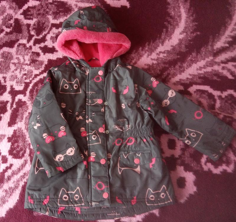 Куртка демисезонна для дівчинки,темно-сіра в котячий принт,дочці дуже подобалась. Розмір 92-98, і ідеальному стані,одягалась мало,є декілька подряпин на кнопках,малопомітно. Дуже зручна як в користуванні так і в догляді.