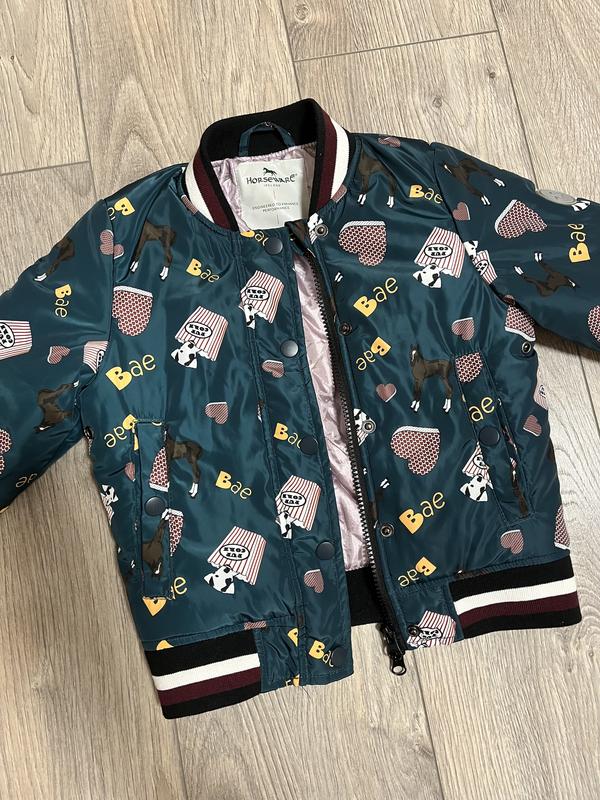 Крутой бомбер для девочки с лошадями бренда horseware Красиво набита, держит форму Размер 98-104/3-4 года Замеры: Рукав - 41 Между руками - 35 Длина по спине - 42