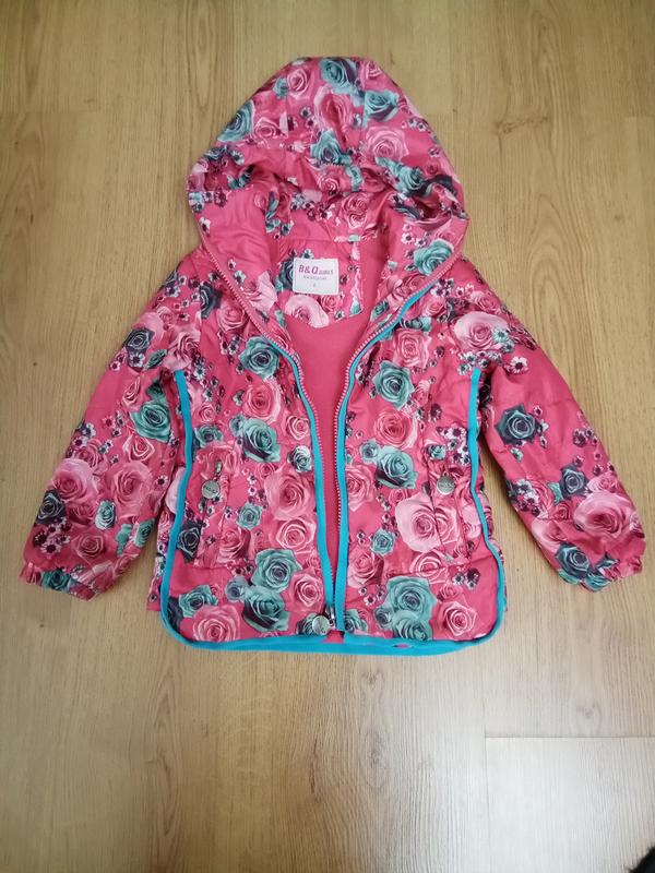 Куртка на девочку разовая с цветочным принтом. Подойдет на 3-4 года. Рукав на резинке. Длина по спине 43 см, длина рукава 37 см.