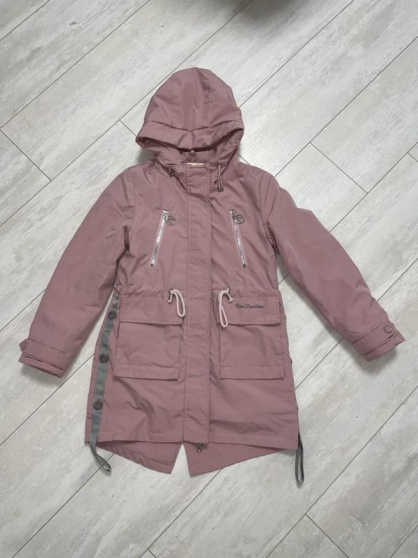 Удлиненная куртка на девочку рост 134 см в красивом состоянии (осень - весна), есть один дефект (на фото видно) - сзади нет одной заклепки, отсутствие которой не влияет на качество вещи, в другом очень удобная, макжет манжеты на рукавах, регулируется пояс Ног -41 см, длина спереди -68 см, длина сзада -78 см, длина рукава - 52 ( от плеча)