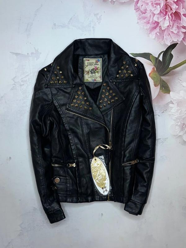 Курточка косуха Декоративные шипы Тёплая подкладка махра Есть 2 кармана Новая 8 лет/128-будет дольше. Длина 47(45)ПОГ 41. Рукав 49(+9). Плечи 35