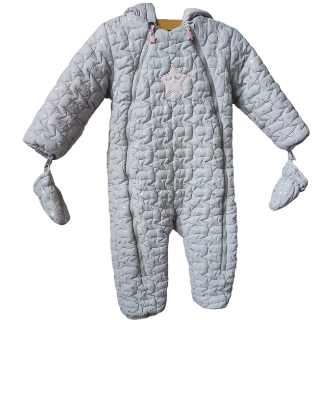 Комбинезон демисезон 5.10.15. В хорошем состоянии, ребенку одевали с 8 мес., носили до 3 лет. Стирается хорошо, все целое, есть перчатки. Цвет серый с серебряными звездами, в середине розовый. Купили в Варшаве. ПО плечу 26 ПО грудь 36 Длина изделия по спине 46 Длина рука 33 Длина штанины 27