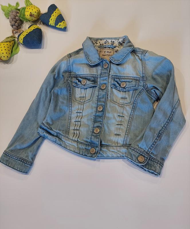 Джинсовая куртка, жакет Next голубого цвета в хорошем состоянии. Есть маленькое пятнышко на рукаве и точечка на кармане. Думаю можно вывести. На бирке указан возраст. Внутри манжетов вставки в цветочный принт, можно закатывать рукава.4-5 лет. Замеры по запросу.